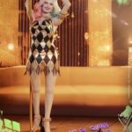 - Одно (1) черно-золотое платье из ткани с ромбовидным узором