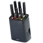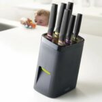 Когда в доме дети, родители пытаются разместить острые предметы вне досягаемости, чтобы ребенок не смог пораниться. И это правильно! Однако больше не обязательно прятать все ножи в ящик стола. Новинка от Joseph Joseph – инновационный набор ножей «LockBlock», находящийся в специальной подставке с защитой от детей – идеальное решение данной проблемы! Благодаря функциональному дизайну и уникальной разработке ножи надежно фиксируются в блоке, не позволяя ребенку достать нож. Большинство детей в возрасте до 5-ти и около просто-напросто не смогут вытащить ни один нож, поскольку лезвие удерживается специальным механизмом Cam-Lock. Просто потянув нож, не получится его достать, в таком случае сила хвата лишь увеличится. При этом вероятность повреждения лезвий нулевая, внутри механизма совершенно гладкая поверхность. Чтобы вытащить инвентарь, следует нажать и удерживать кнопку фиксатора. Это позволяет легко и быстро достать нож, конечно же, для взрослого человека. Правильное позиционирование кнопки и сила, необходимая для ее нажима, не позволят ребенку и близко приблизиться к острым лезвиям. Состоит набор из 6-ти высококачественных ножей из нержавеющей стали. Каждый нож отшлифован по краям, что гарантирует максимально точное и эффективное нарезание. Их эргономичные ручки обладают шероховатой и нескользящей поверхностью, а также обозначены различными цветами, которые соответствуют определенному слоту. Размер: 14 x 14 x 37,3 см