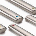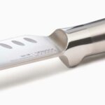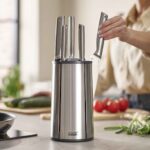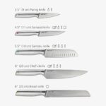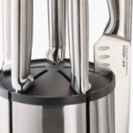 Каждый нож имеет лезвие из японской нержавеющей стали и утяжеленную стальную ручку со встроенной подставкой, которая предотвращает касание лезвия рабочей поверхности при опускании. Вращающаяся подставка имеет легкодоступные магнитные пазы для ножей, нескользящее основание и выполнена из матовой нержавеющей стали 18/8 с покрытием, устойчивым к отпечаткам пальцев.
