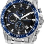 Стильный хронограф с точным кварцевым механизмом установлен в прочный корпус из нержавеющей стали. На контрастный безель вынесена секундная разметка. Широкий матовый циферблат черного цвета с синими элементами вмещает хорошо читаемые стрелки часов и минут с люминесцентным покрытием. В часах предусмотрены дополнительные индикаторы: минутный и секундный накопители, счетчик 1/10 секунд и окошко даты. Ударопрочное минеральное стекло Crystex надежно защищает циферблат от внешних воздействий. Повышенная водостойкость равна 10 атмосфер. На браслет из стальных звеньев установлена удобная в использовании застежка-клипса. Функциональный и надежный хронограф Jacques Lemans создан для тех, кто предпочитает активный образ жизни.