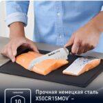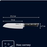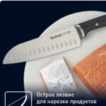 Нож сантоку Tefal Ice Force 18 см K2320614 — это высококачественный кухонный инструмент, который станет незаменимым помощником на любой кухне. Изготовленный из прочной немецкой стали этот нож обеспечивает выдающуюся долговечность и надежность, делая его идеальным для повседневного использования. Одной из основных особенностей данного ножа является ледяная закалка лезвия до -120 градусов, что придает ему исключительную прочность и устойчивость к коррозии. Эта передовая технология помогает сохранить остроту лезвия, обеспечивает идеальную текстуру ингредиентов при приготовлении и упрощает их нарезку. Лезвие ножа сантоку отличается своей остротой и универсальностью, позволяя легко справляться с разнообразными кулинарными задачами, такими как нарезка мяса, рыбы, овощей и фруктов. Его форма идеально подходит для быстрого и точного реза, делая процесс готовки более легким и приятным.Нож также оборудован больстером из нержавеющей стали, который не только добавляет эстетичности, но и обеспечивает дополнительную стабильность и баланс во время работы. Это способствует комфортному контролю при резке, гарантируя безопасность и эффективность. Эргономичная ручка ножа разработана с учетом удобства пользователя, обеспечивая надежный хват и минимизируя нагрузку на руку при длительном использовании кухонных принадлежностей. Она позволяет удобно и уверенно работать с ножом, что делает его идеальным выбором как для профессиональных поваров, так и для домашней кухни.Нож сантоку Tefal Ice Force — это великолепное сочетание качества, функциональности и стиля, которое поможет вам создавать кулинарные шедевры с легкостью и удовольствием!