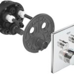 верхняя монтажная панель, дивертор, излив, картридж, смеситель, термостат, термоэлемент, Запорный вентиль, Кран для сантехники, Нажимной, Наружная часть, Панель смесителя, Смеситель для ванны и душа, Смеситель термостатический, Термостат для ванны и душа, кнопочный, скрытый монтаж, назначение: для душа, материал: латунь, пластик, количество потребителей: 2