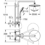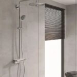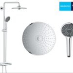 В комплект входят: горизонтальный поворотный душевой кронштейн 450 мм, настенный термостат с аквадимером, верхний душ Vitalio Joy 260, ручной душ Vitalio Joy 110 Massage, душевой шланг VitalioFlex Silver 1,750 мм, полочка GROHE EasyReach