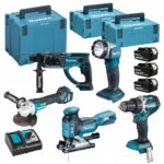 КОМПЛЕКТАЦИЯ 🎁 Набор Makita DLX5044TJ, включающий: Дрель-шуруповерт DDF484, Угловая шлифмашина DGA513, Перфоратор DHR202, Лобзик DJV181, Фонарь DML802, 3 аккумулятора BL1850B 5.0 А·ч, Зарядное устройство DC18RC, 3 кейса Makpac.